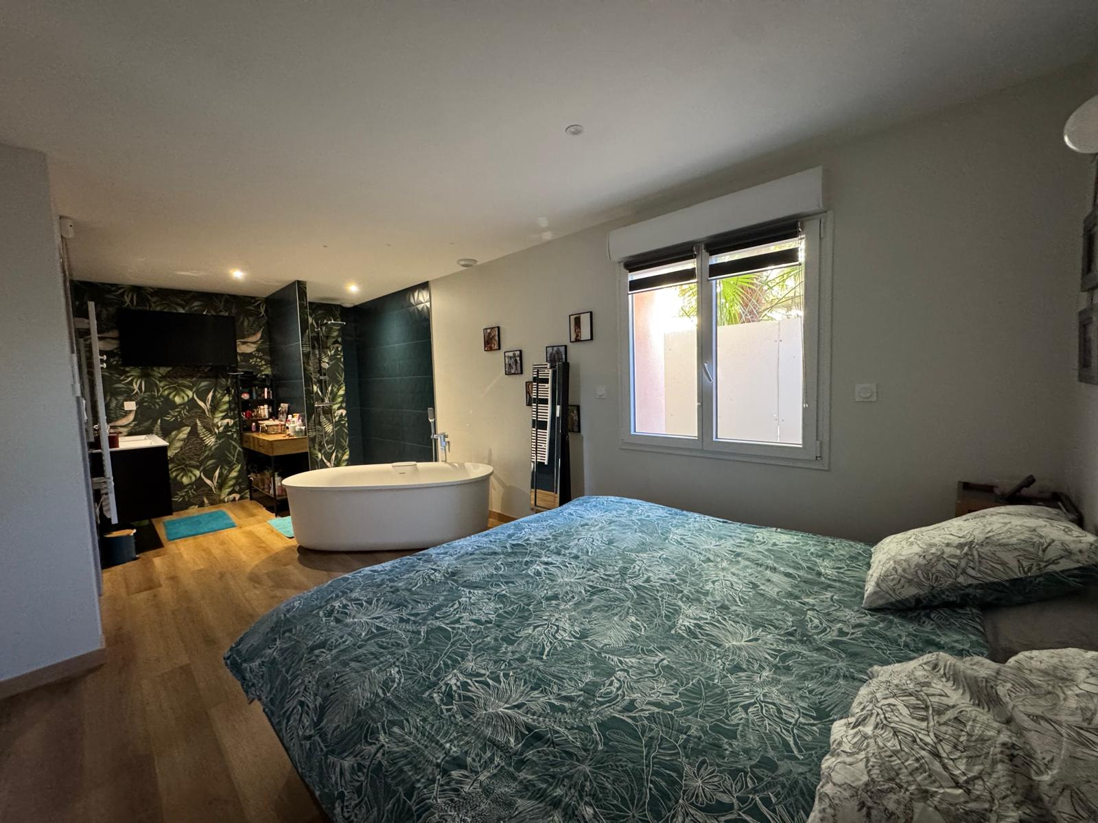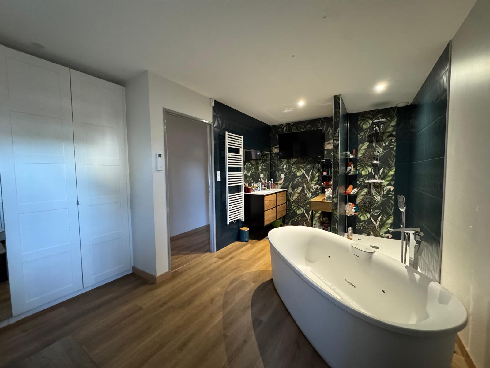 En rez-de-chaussée, Deux chambres supplémentaires, dont une suite parentale avec salle d’eau privative, une buanderie et un garage complètent ce niveau.